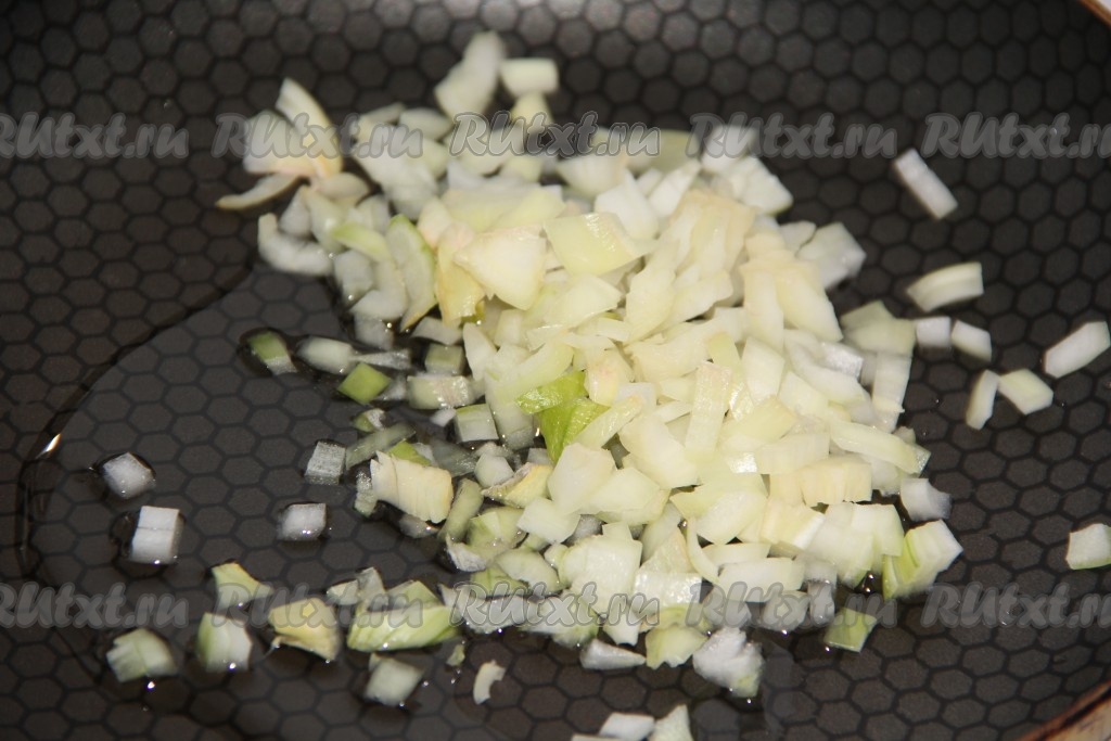 Пока варится суп, мы приготовим овощную зажарку. Лук очистить, нарезать мелко, а затем обжарить, помешивая, на среднем огне на сковороде, разогретой с растительным маслом, до золотистости.