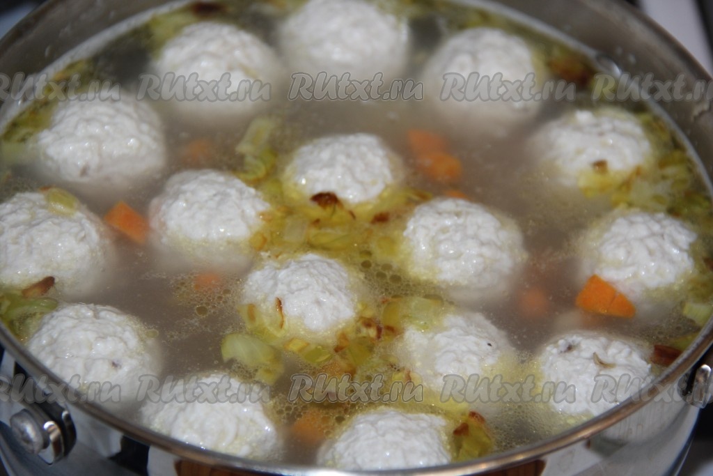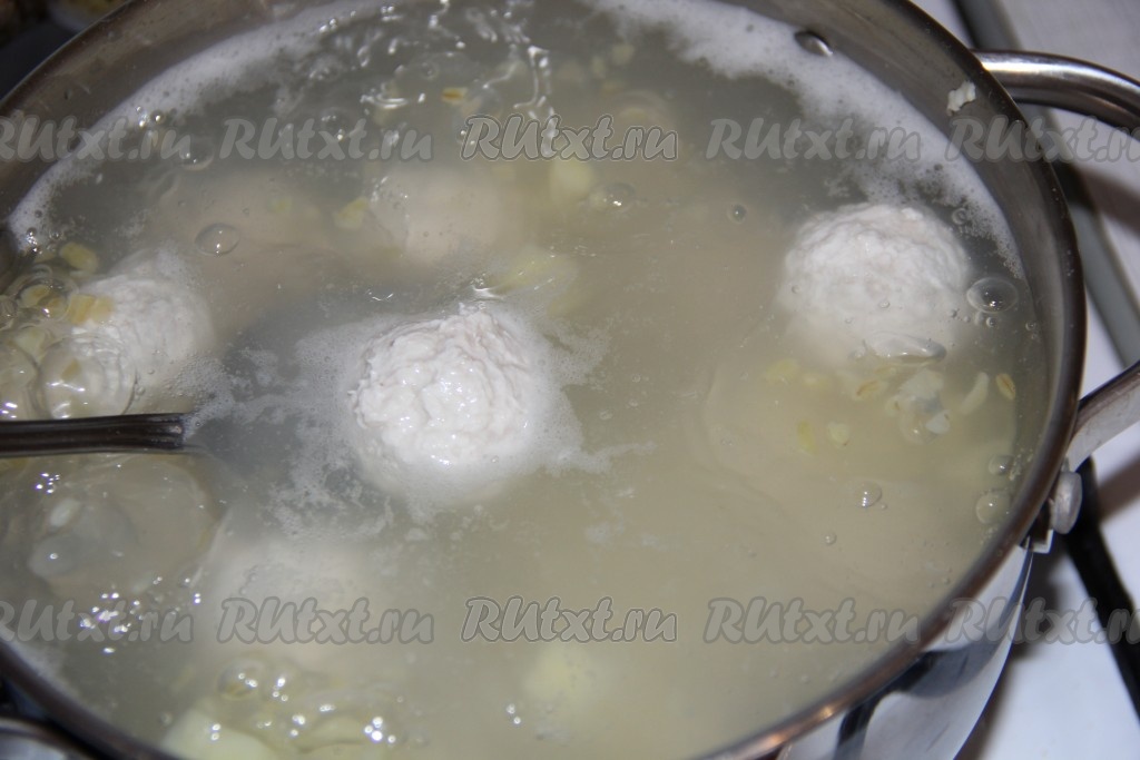 Фрикадельки опустить в кипящий бульон с булгуром и картошкой. После закипания уменьшить огонь и варить суп минут 15.