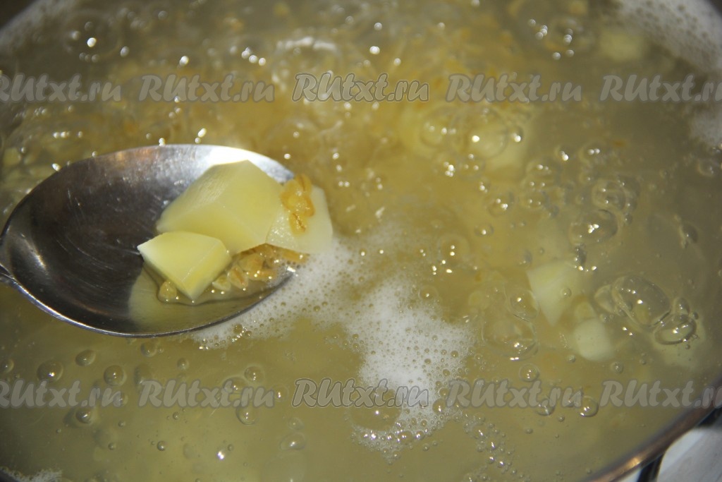 Булгур промыть водой и добавить в кипящую воду с картошкой.