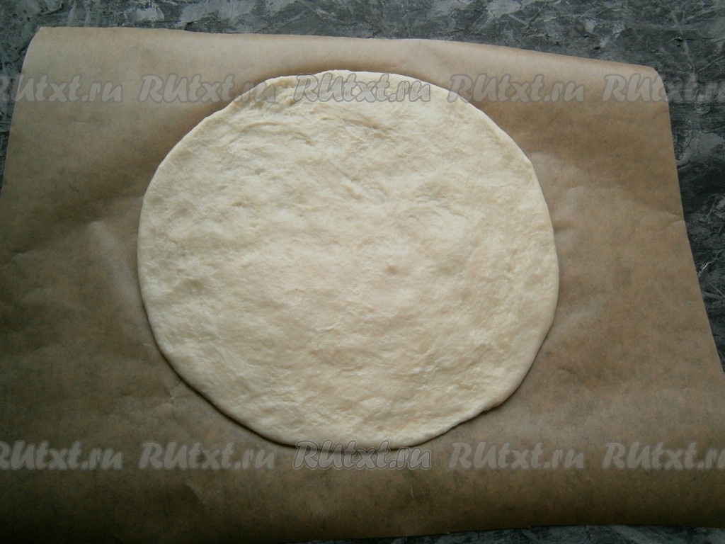 На листе пергамента охлаждённое тесто раскатать в тонкую круглую лепёшку толщиной около 0,3-0,5 см. Раскатанное тесто вместе с пергаментом переложить на противень.