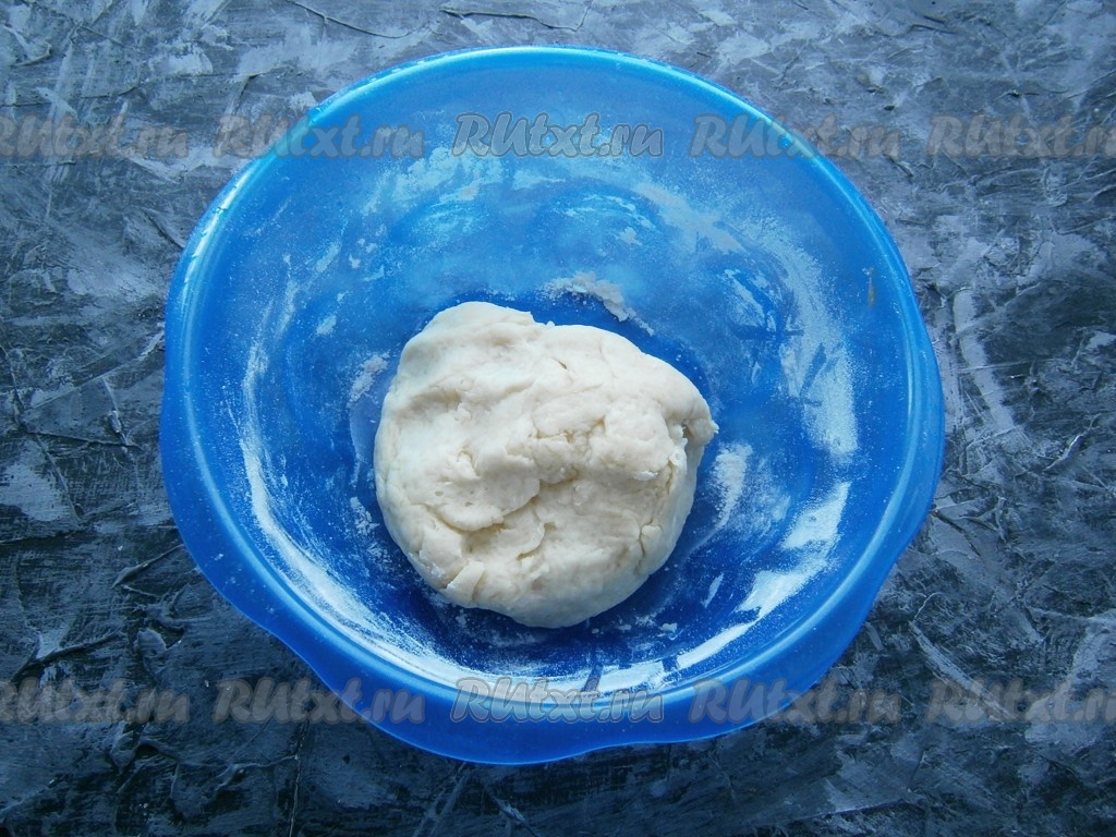 Далее вливать кипяток и сразу, перемешивая ложкой, начать замешивать тесто. Когда тесто немного остынет, продолжить замешивать тесто руками. Делать это нужно осторожно, тесто будет достаточно горячим. В результате замешивания получится достаточно мягкое, но плотное тесто. Дать тесту остыть при комнатной температуре. Обернуть остывшее тесто пищевой плёнкой и отправить в холодильник на 30-40 минут.