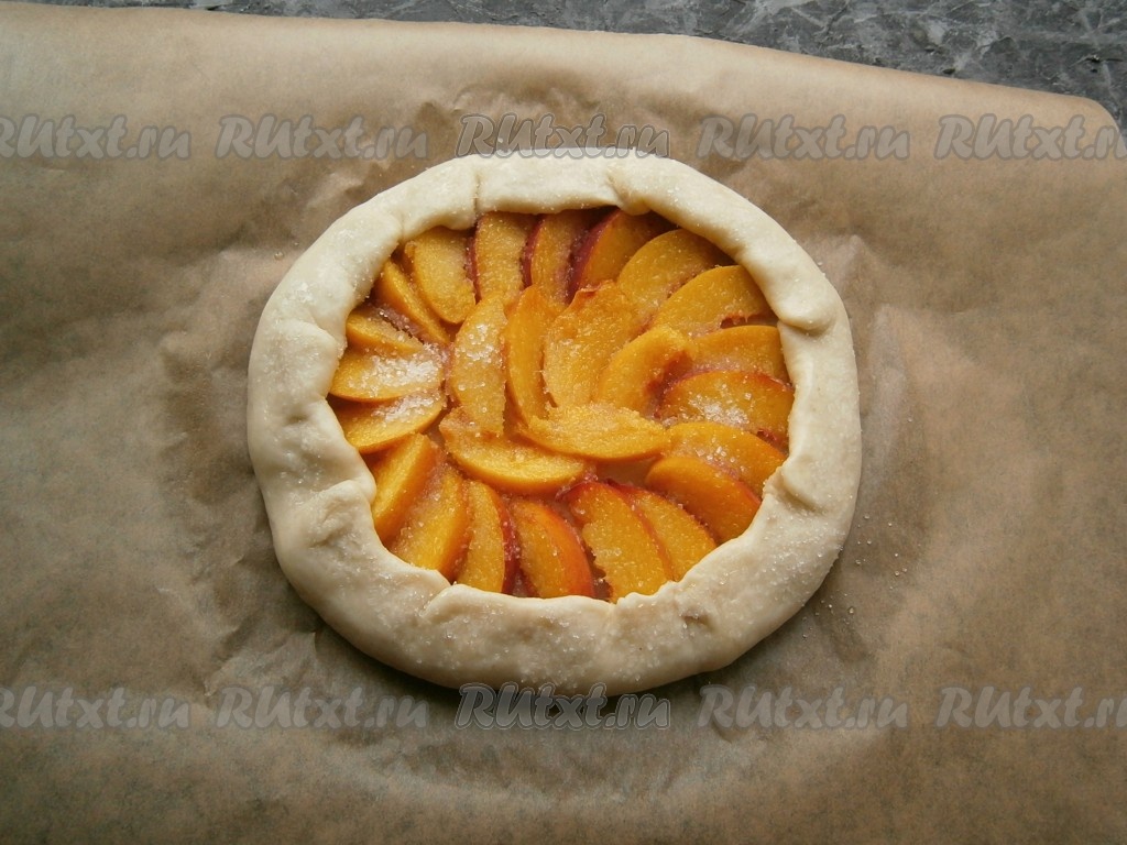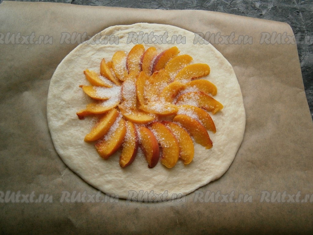Персики вымыть, обсушить, удалить косточки. По центру теста, не доходя до краёв 7-8 см, выложить нарезанные дольками персики, посыпать их 2 столовыми ложками сахара.