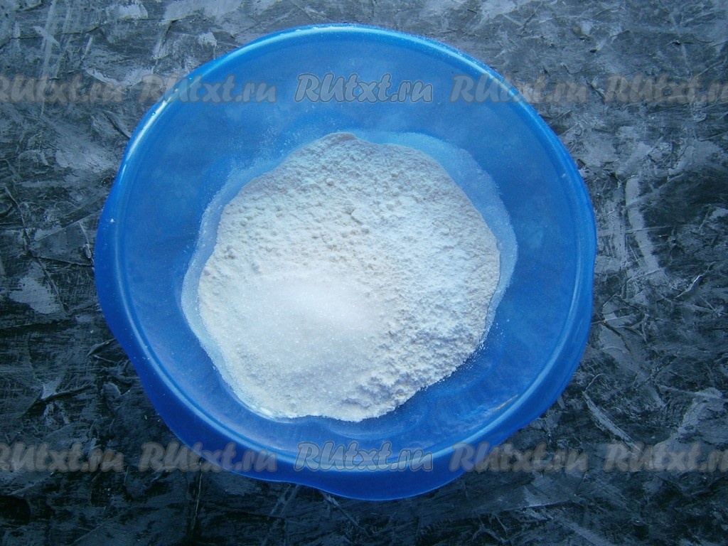 Вначале приступим к замешиванию теста, для этого в муку нужно добавить соль, разрыхлитель и сахар, перемешать.