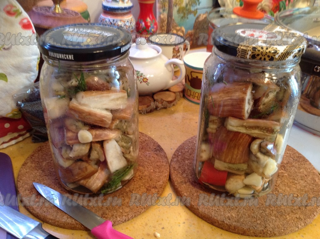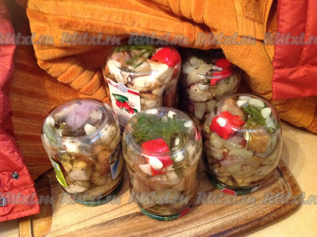 Залить банки с баклажанами граффити кипящим маринадом и закрутить прокипяченными крышками. Затем укутать до полного остывания.