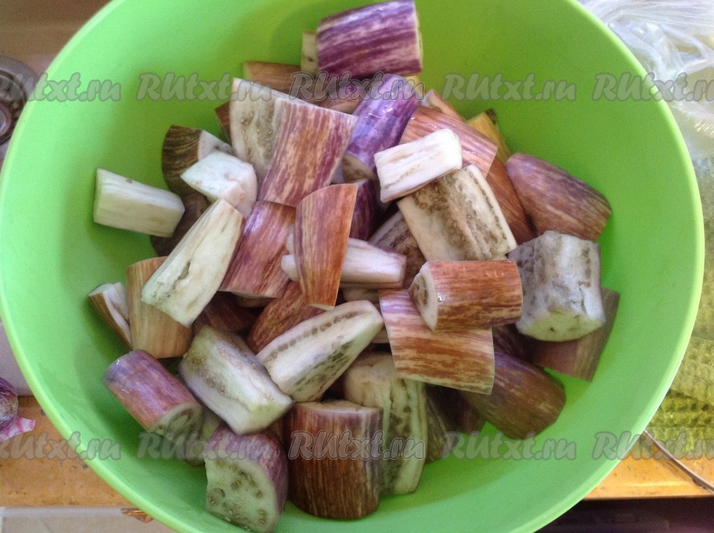 В кипящую воду опустить нарезанные баклажаны (если все баклажаны не поместятся в кастрюлю, отваривайте их несколькими партиями) и варить 5 минут с момента закипания.