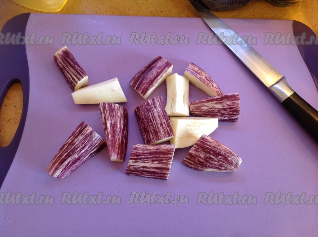 Отрезать хвостики у баклажанов и нарезать их вдоль на крупные кусочки.