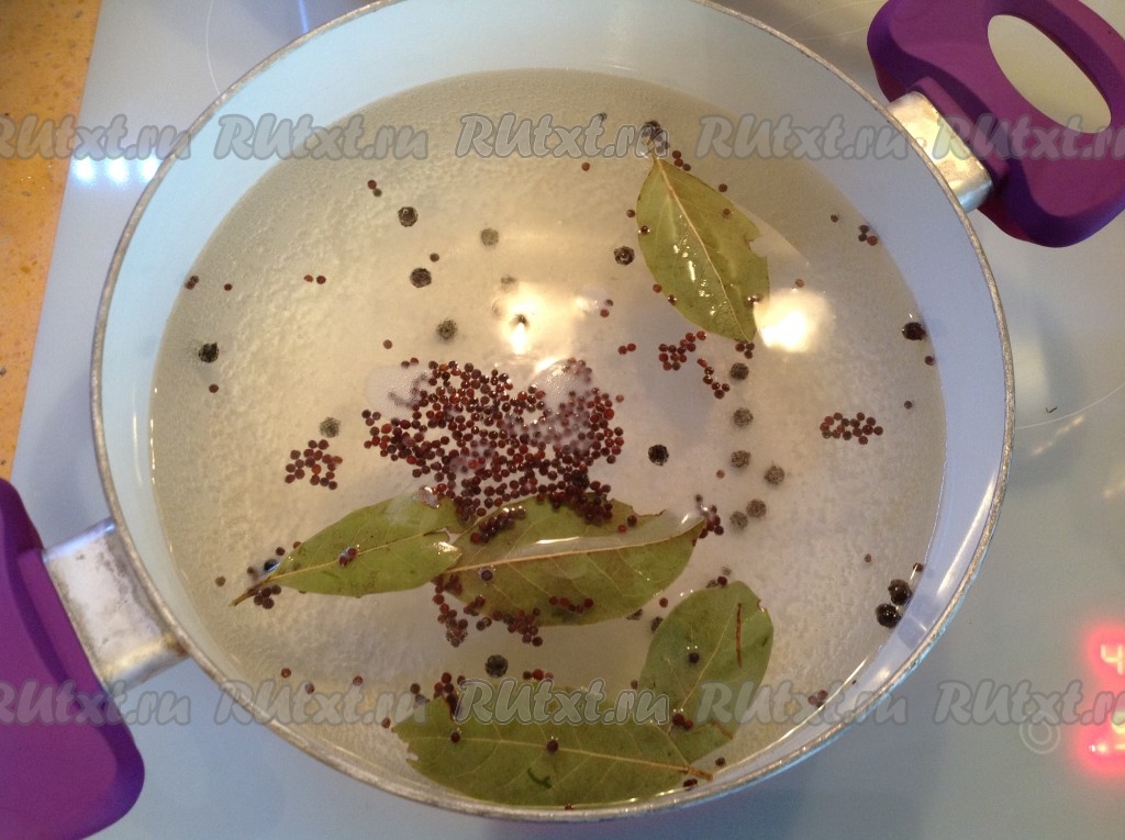 Для приготовления маринада в кастрюлю налить воду, добавить соль, сахар, перец, лаврушку и семена горчицы. Довести до кипения, варить 2 минуты на небольшом огне, затем добавить уксус.