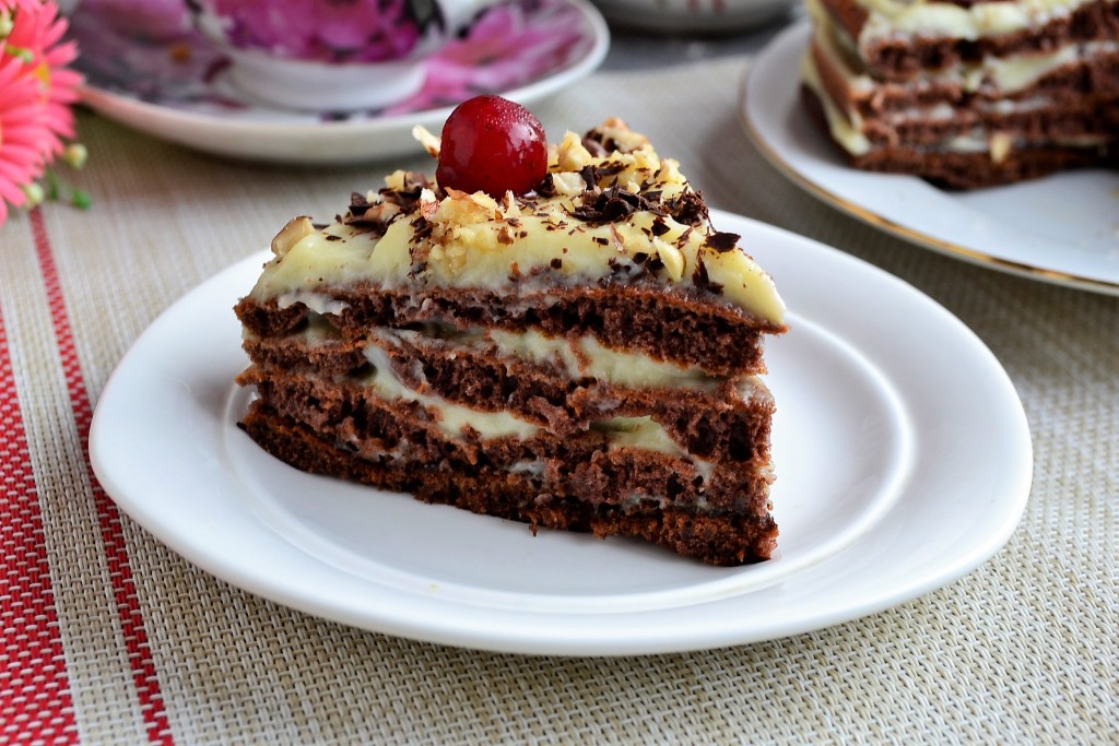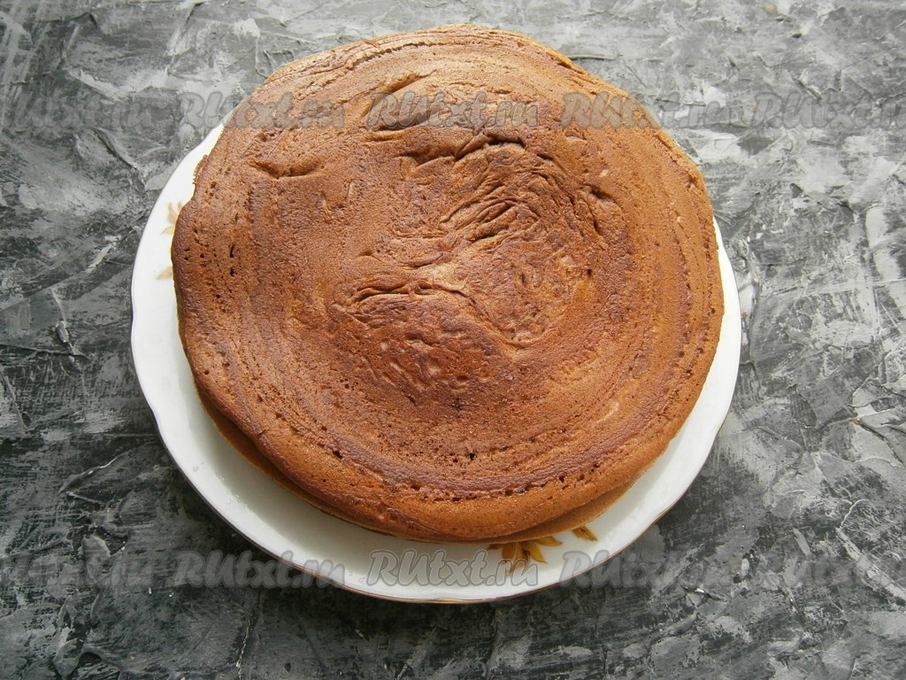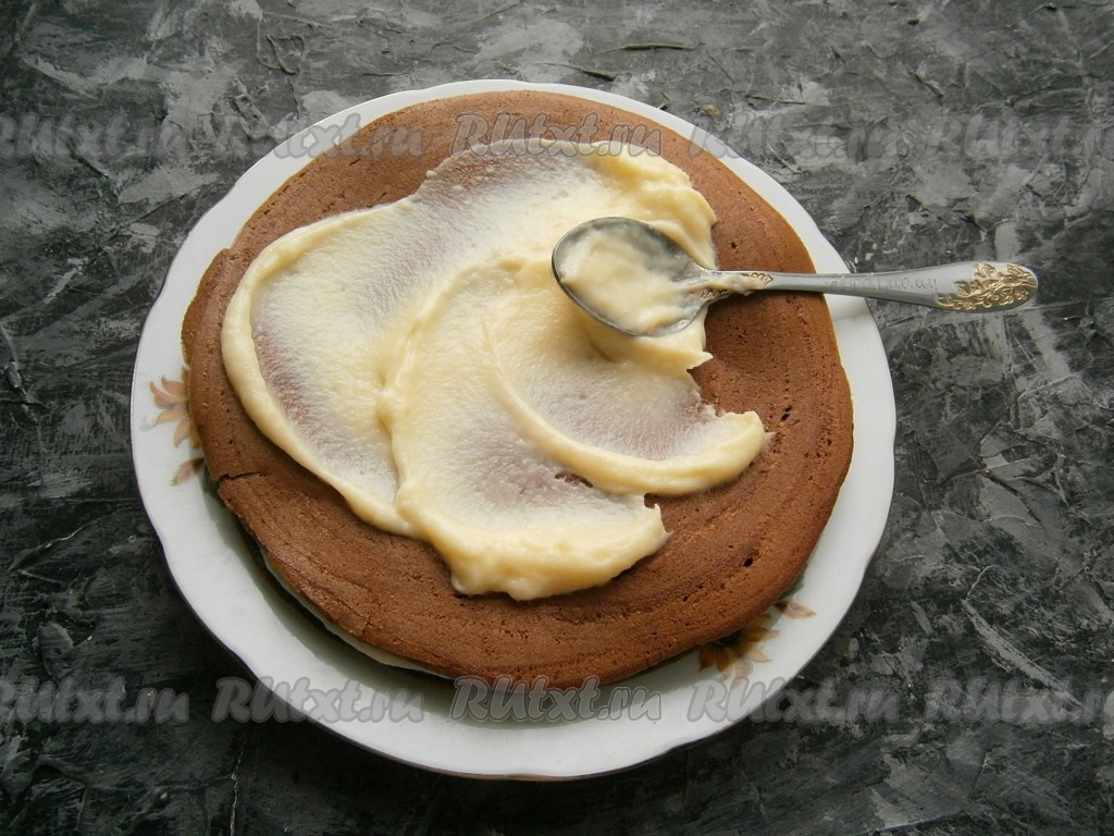 Перемазать коржи кремом, я использовала отличный заварной крем, приготовленный в микроволновке.