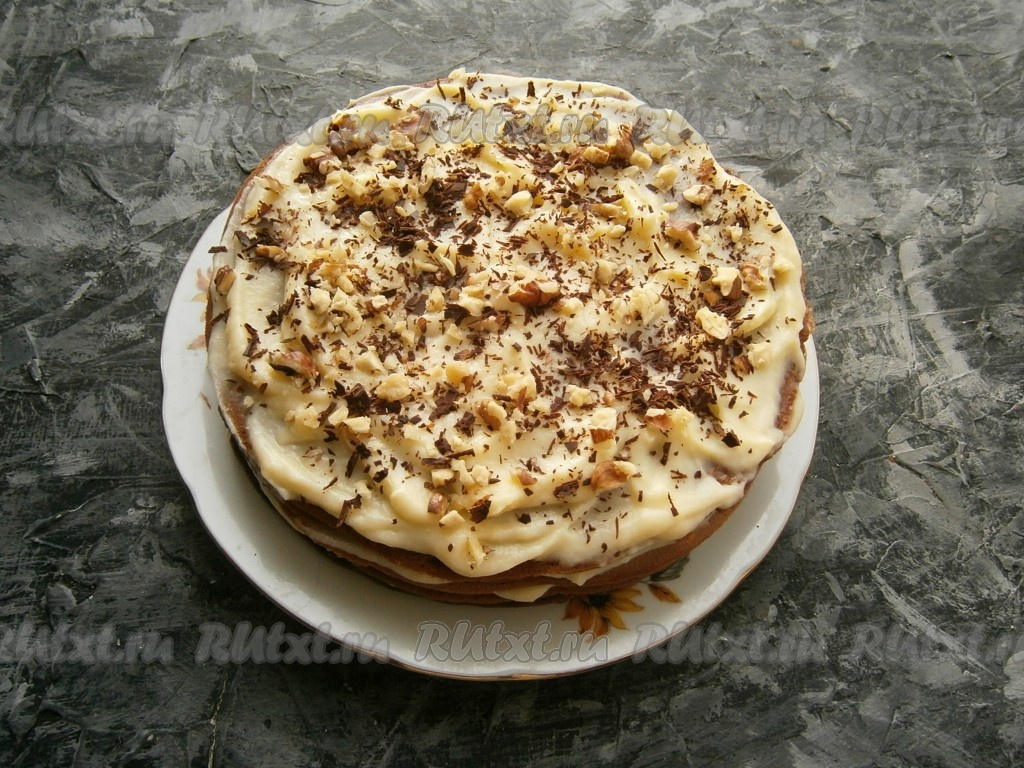 Верх тортика посыпать рублеными орехами и тёртым шоколадом.