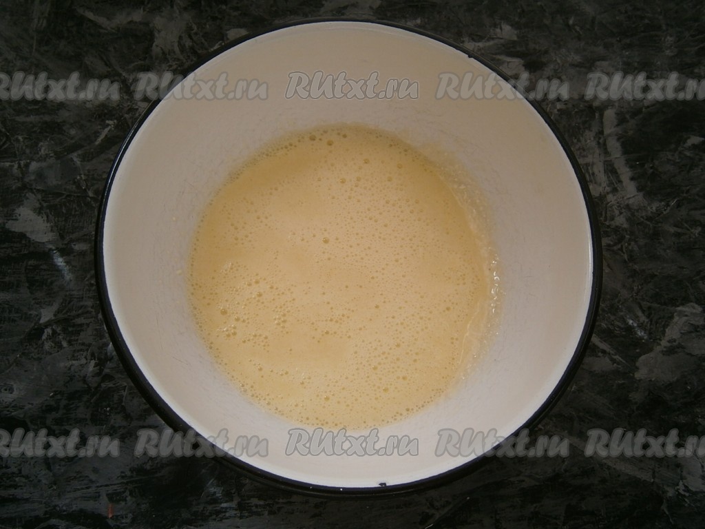 Перемешать получившееся тесто и взбить миксером до однородности. Тесто получится достаточно жидким, по консистенции чуть гуще, чем тесто для толстых блинов.