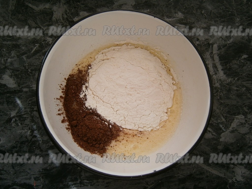 Добавить в получившуюся яичную смесь немного остывшую медовую смесь, перемешать. Всыпать просеянную муку и какао-порошок.