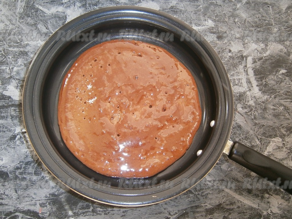 Сковороду разогреть на небольшом огне (ничем не смазывать), выложить 4-5 столовых ложек теста, равномерно разровнять его ложкой по всему дну сковороды (диаметр моей сковороды 19 см).