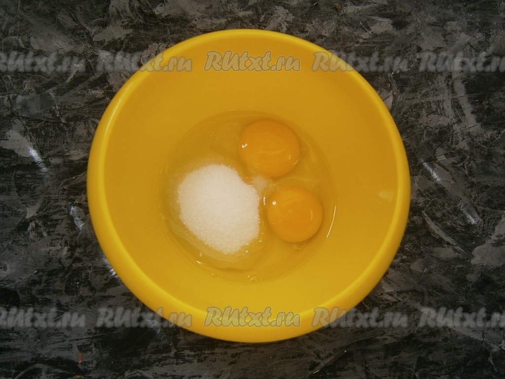 В отдельную миску вбить два яйца, добавить соль и сахар.