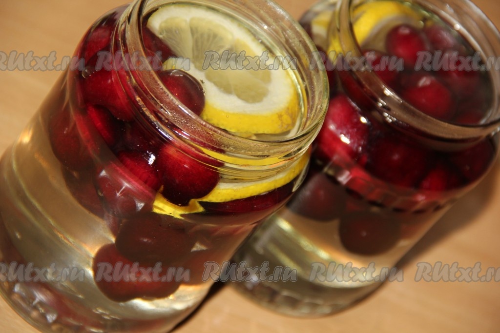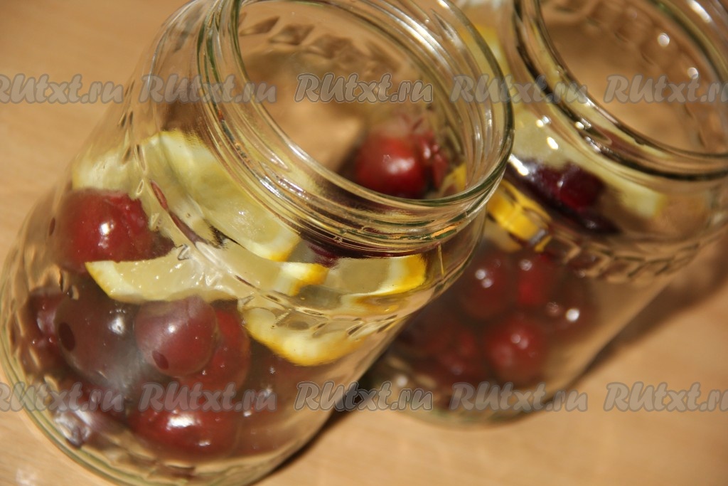 В банки выложить черешню (я поровну разделила ягоды и разложила по двум баночкам) и по 2 кружочка лимона.