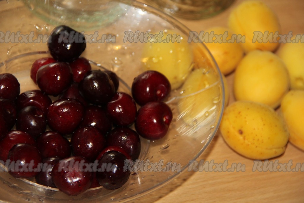 Черешню и абрикосы вымыть. Из черешни косточки удалять не нужно. Каждый абрикос разрезать на две половинки и удалить косточку.
