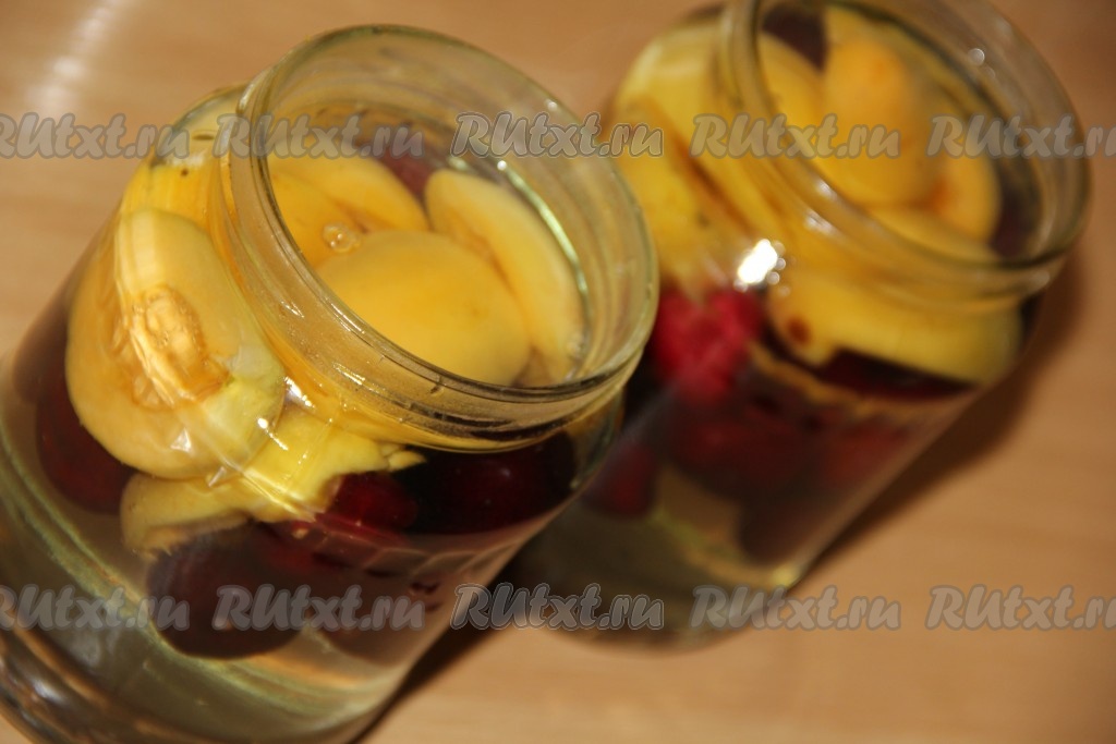 Банки с черешней и абрикосами до самого верха залить горячим сиропом.