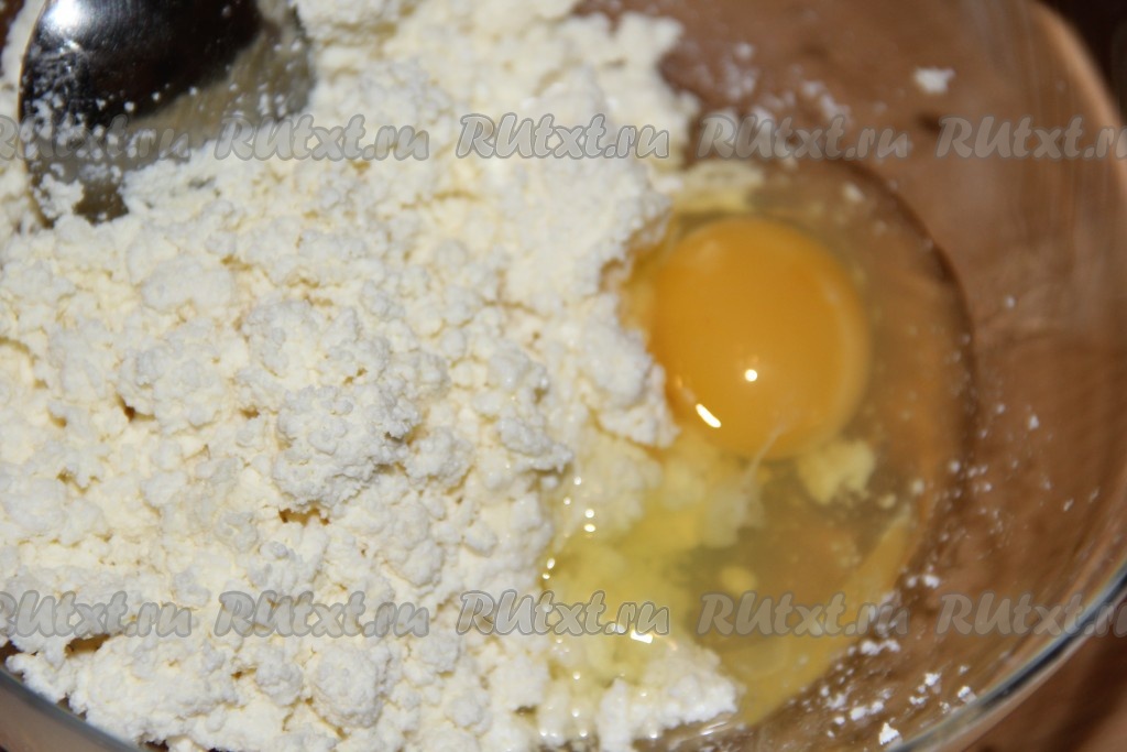 В творог добавить яйцо и соль, перемешать вилкой (или ложкой).