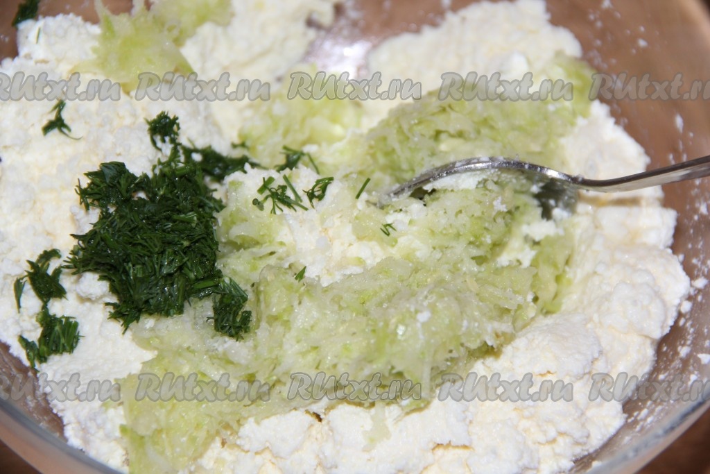 Укроп вымыть, мелко нарезать и добавить к кабачкам и творогу.