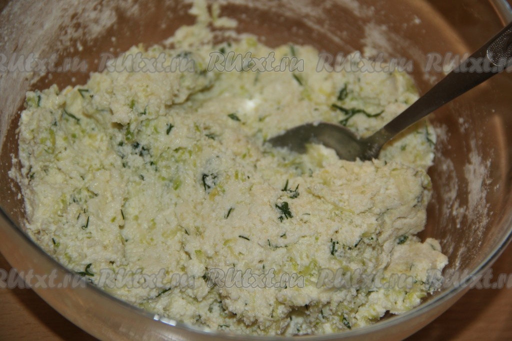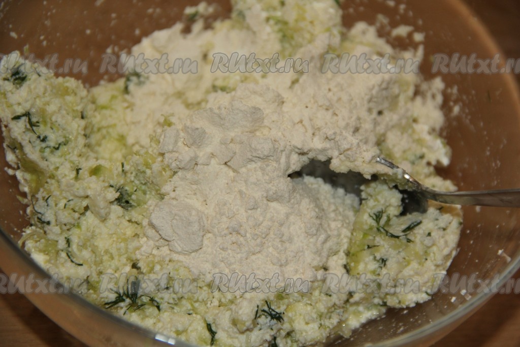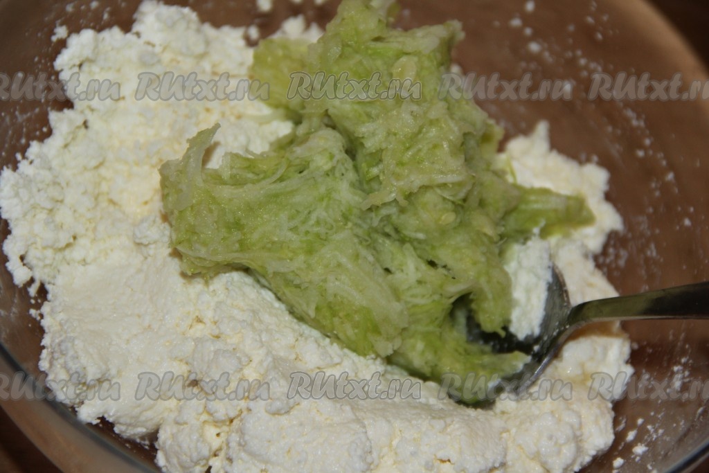 Перемешать творожно-кабачковую массу и всыпать муку, перемешать.
