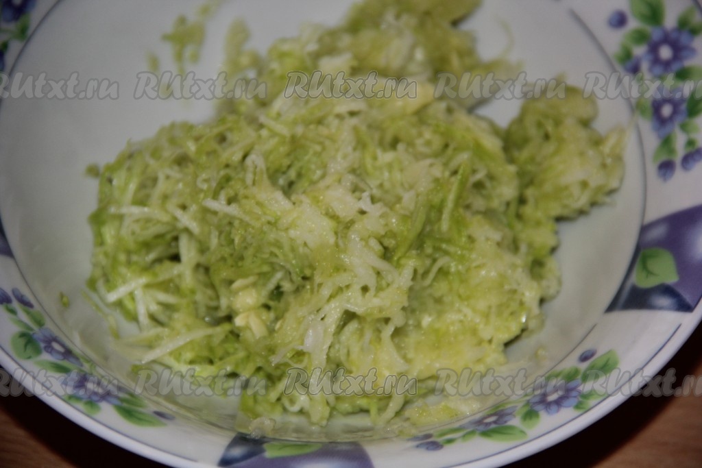 Кабачок вымыть (если шкурка не очень тонкая - её лучше срезать, немолодые семечки тоже нужно удалить) и натереть на мелкой тёрке. Для приготовления сырников понадобится 150 грамм натёртого кабачка. Хорошо отжать сок.