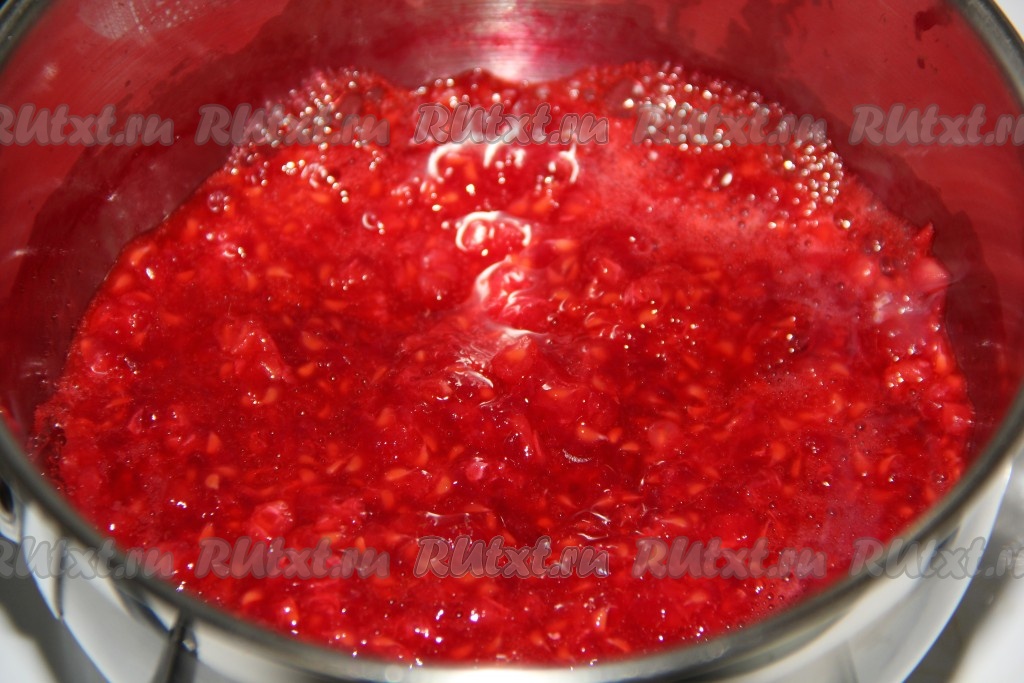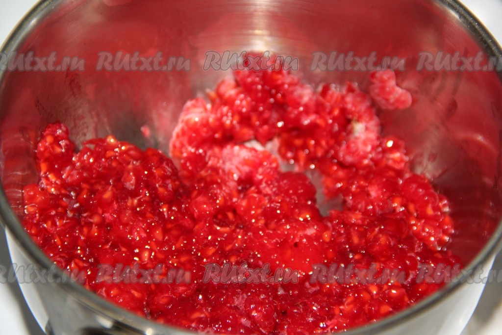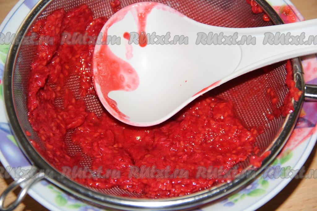 Снять сотейник с огня и откинуть малину на дуршлаг. Перетереть малину через сито, нам нужны только сок и мякоть. Дать ягодному соку остыть.