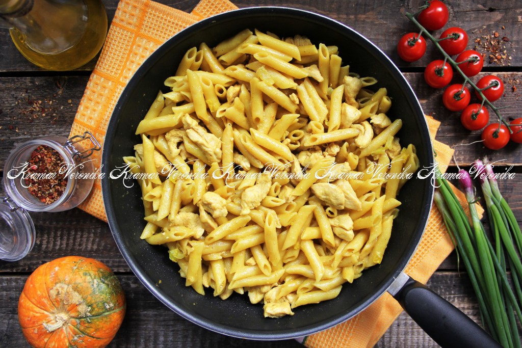 Идею приготовления этого блюда я увидела в видеорецепте и сразу заинтересовалась. Интересен этот рецепт тем, что сухие макароны выкладываются на сковороду к куриному филе, а далее они готовятся вместе. В итоге получается, что на сковороде одновременно готовятся и мясо, и гарнир. Решила попробовать сделать блюдо именно так. Результатом осталась очень довольна. Блюдо получилось аппетитным, сытным, а макароны ещё и пропитались куриным соком. Очень вкусно, попробуйте!
