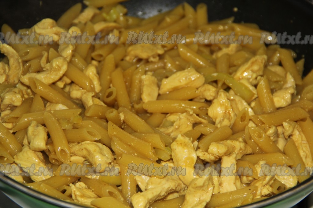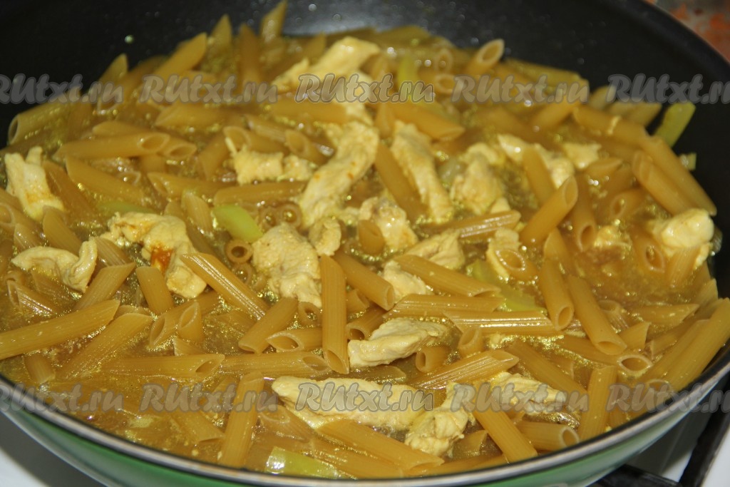 Накрыть сковороду крышкой и готовить макароны с куриным филе на среднем огне, примерно, 15 минут. Вода вся испарится.
