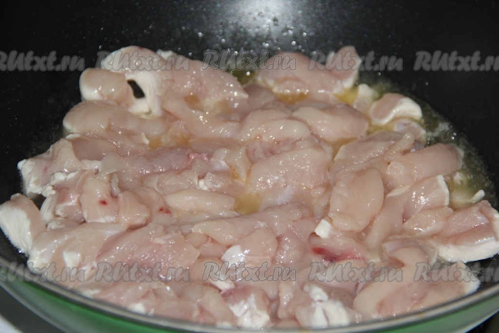 Куриное филе нарезать длинными брусочками, выложить в разогретое масло.