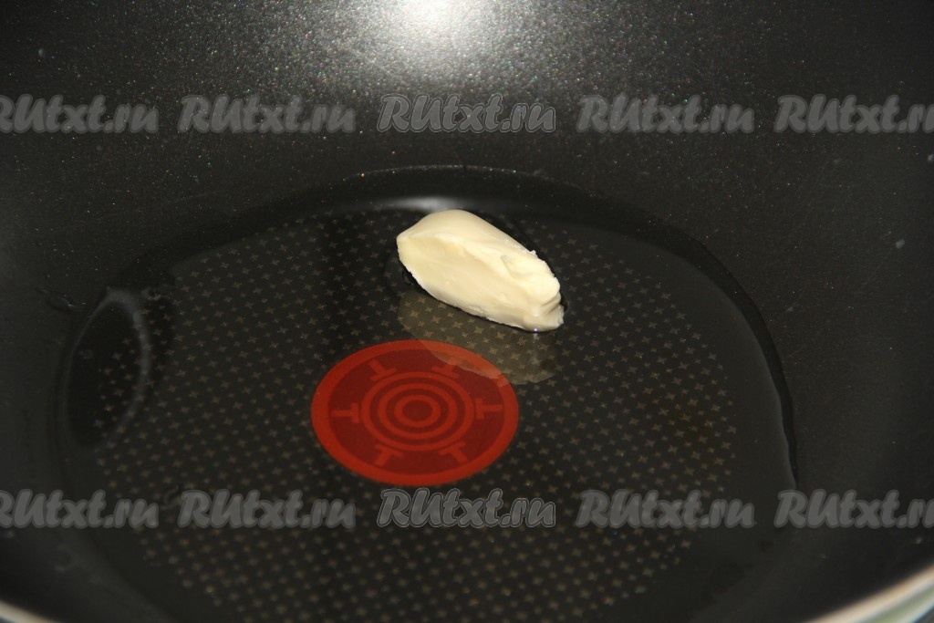 В сковороду с высокими бортиками влить растительное масло, добавить сливочное масло.