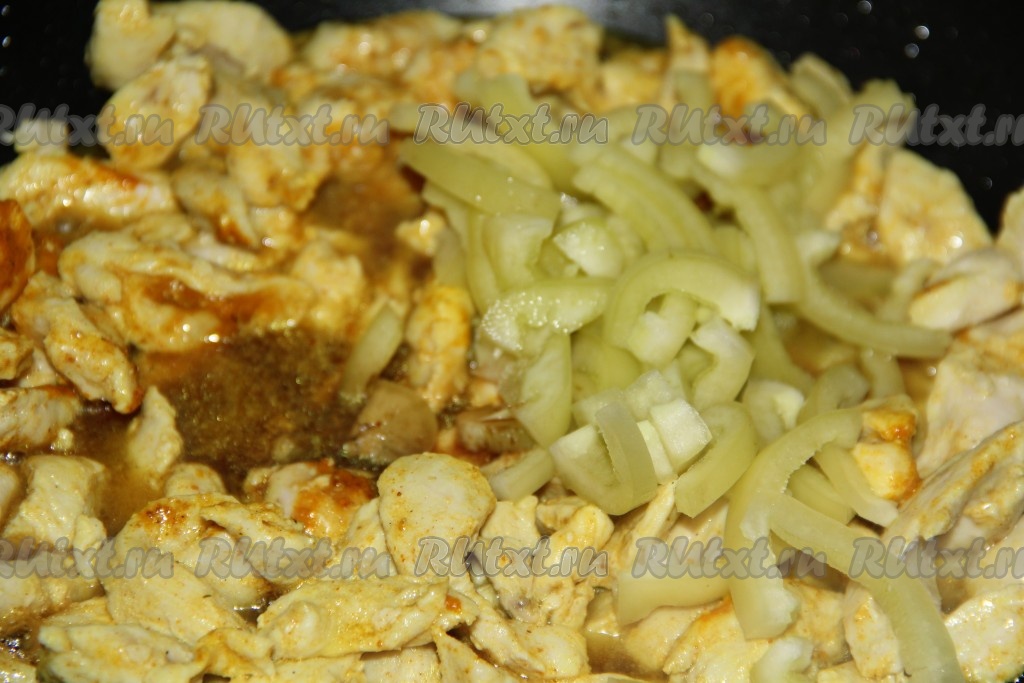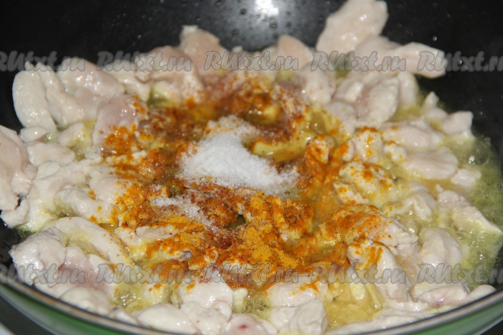 Жарить филе на сильном огне в течение 5 минут, периодически помешивая. Затем к куриному мясу добавить соль (много соли не добавляйте, в дальнейшем будет добавляться достаточно солёный соевый соус), специи и куркуму, перемешать.
