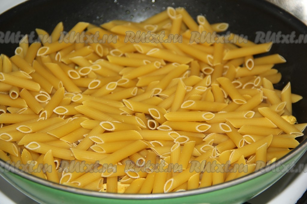 Всыпать в сковороду сухие макароны. Макароны можно использовать любой формы, у меня - "перья".