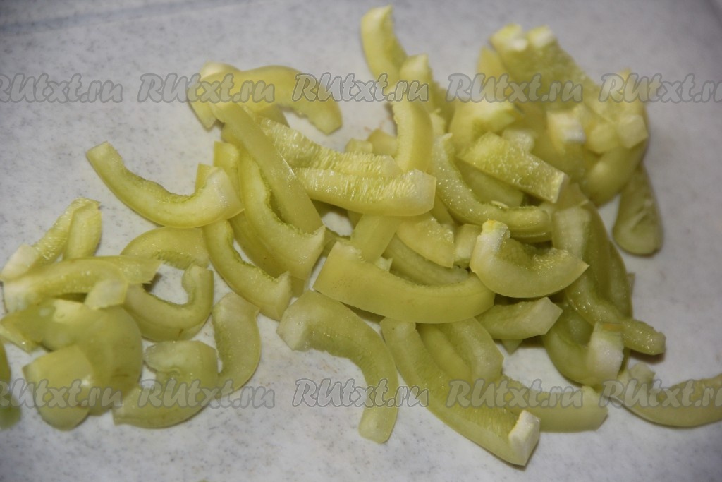 Сладкий перец вымыть, очистить от семян и нарезать на тонкие полоски.