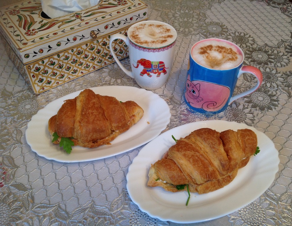Приготовить второй круассан таким же способом. Подать наши вкуснейшие круассаны с сёмгой вместе с любимым напитком. У меня это - капуччино с корицей.