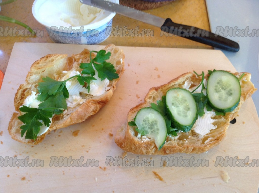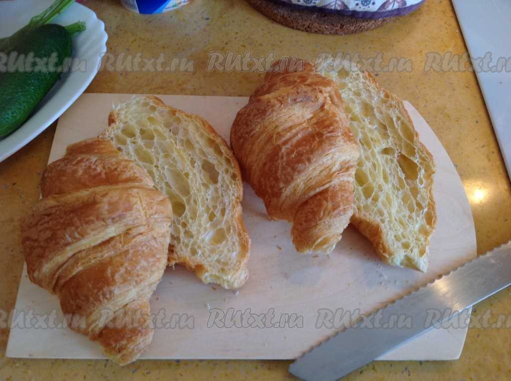 Круассаны разрезать вдоль ножом для хлеба (с зубчиками).
