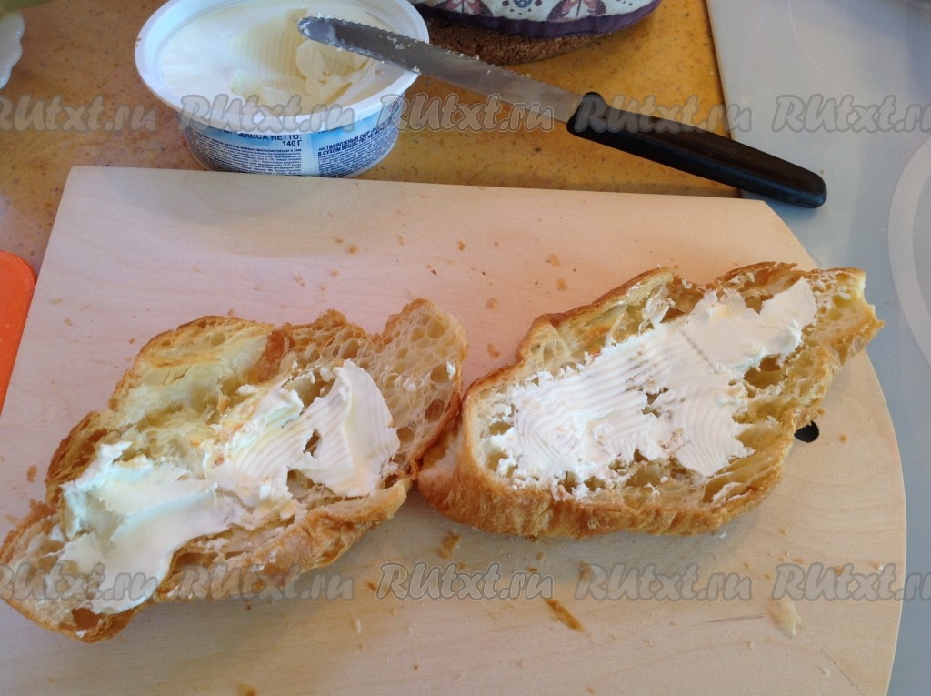 Намазать сливочный сыр на обе половинки тёплого круассана.