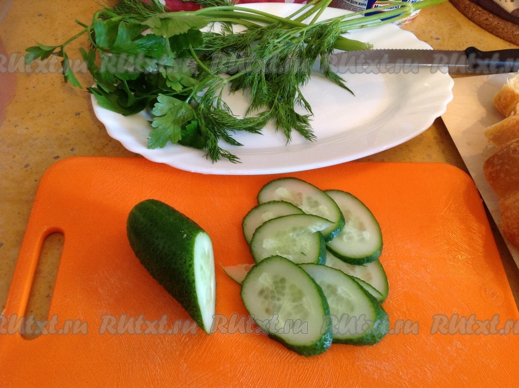 Подготовить зелень и нарезать огурец тонкими колечками.