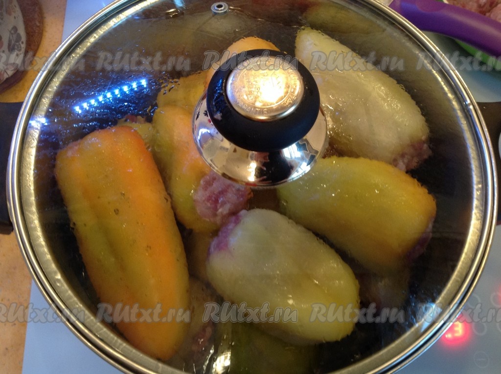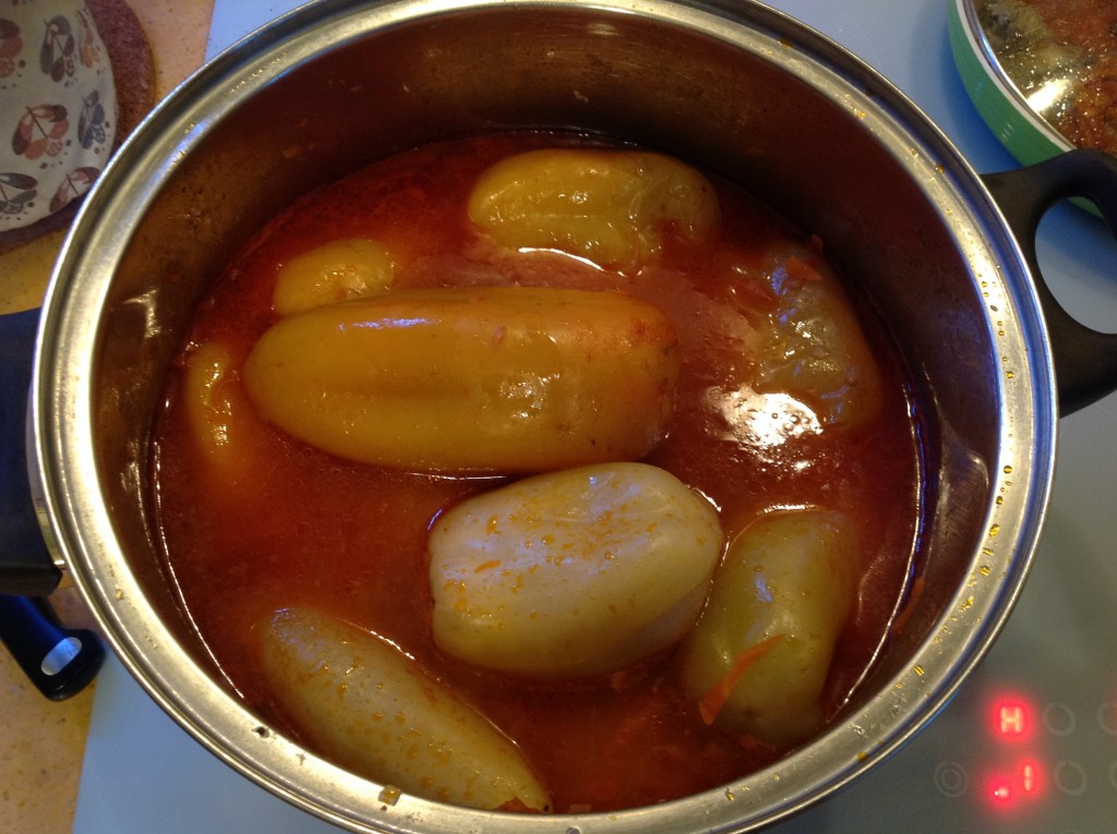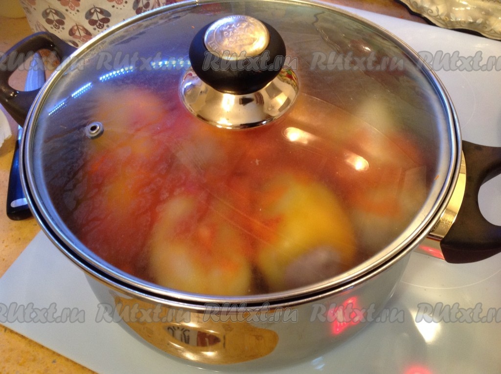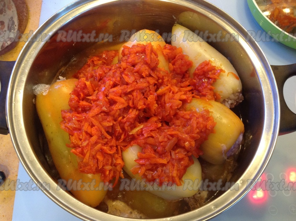 Выкладываем морковно-луковую подливку на фаршированный перец.
