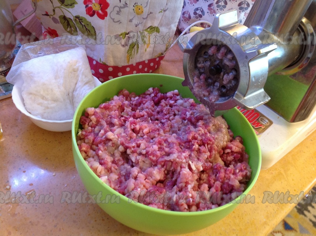 Прокручиваем мясо с нарезанным луком в мясорубке.