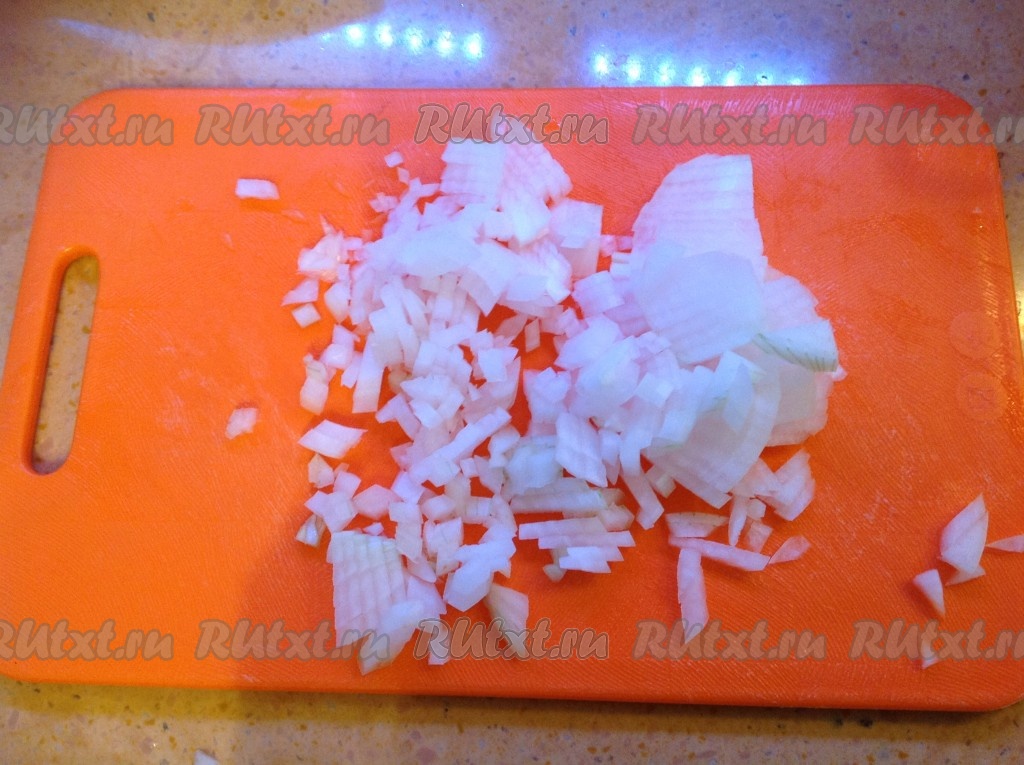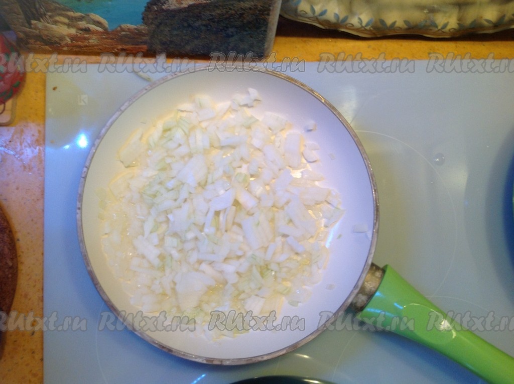 Лук мелко режем и отправляем на разогретую сковороду с растительным маслом.
