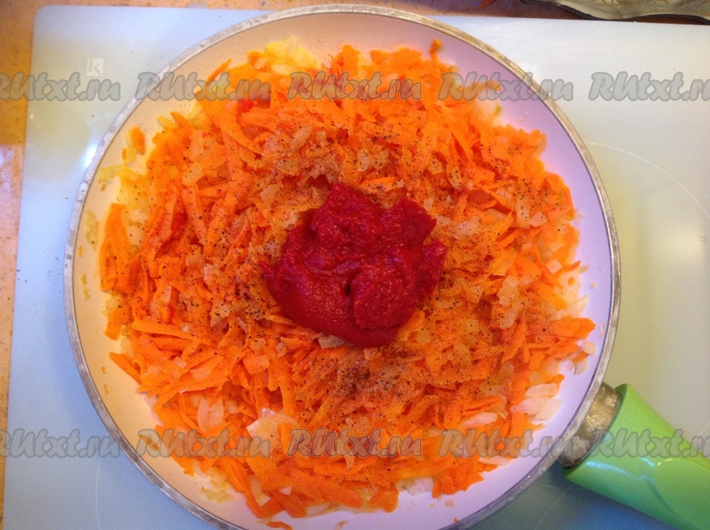Добавляем томат-пасту на сковородку и перемешиваем.