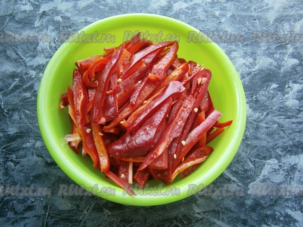 Удалить семенную коробку из каждого перца, а затем нарезать перчики длинными полосками.