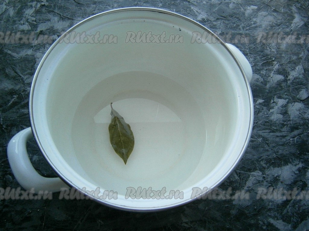 В кастрюлю влить воду, всыпать соль и сахар, добавить уксус и лавровый лист.