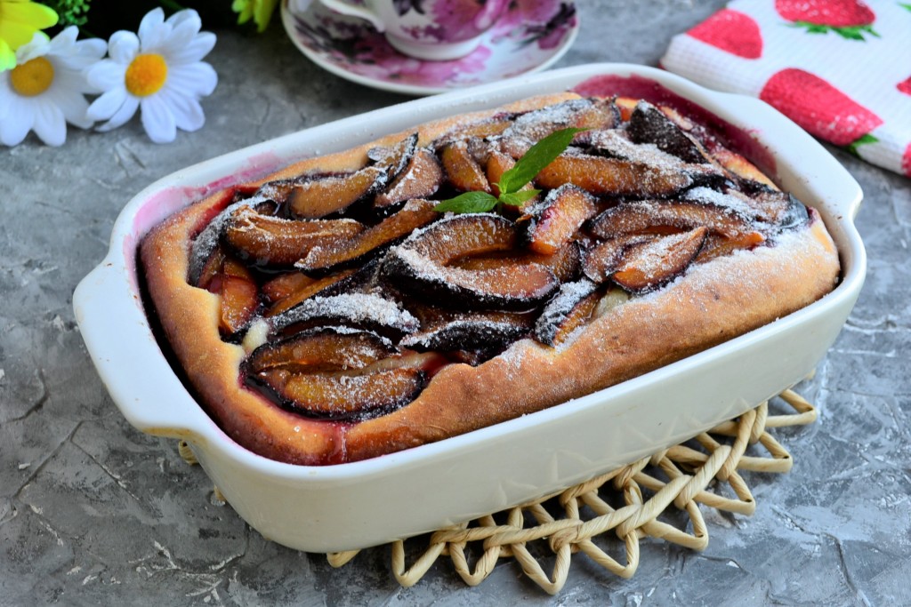 Дать ароматному и очень вкусному немецкому сливовому пирогу остыть в форме до тёплого состояния и затем посыпать сахарной пудрой. Остудить полностью и нарезать аккуратно на части.
