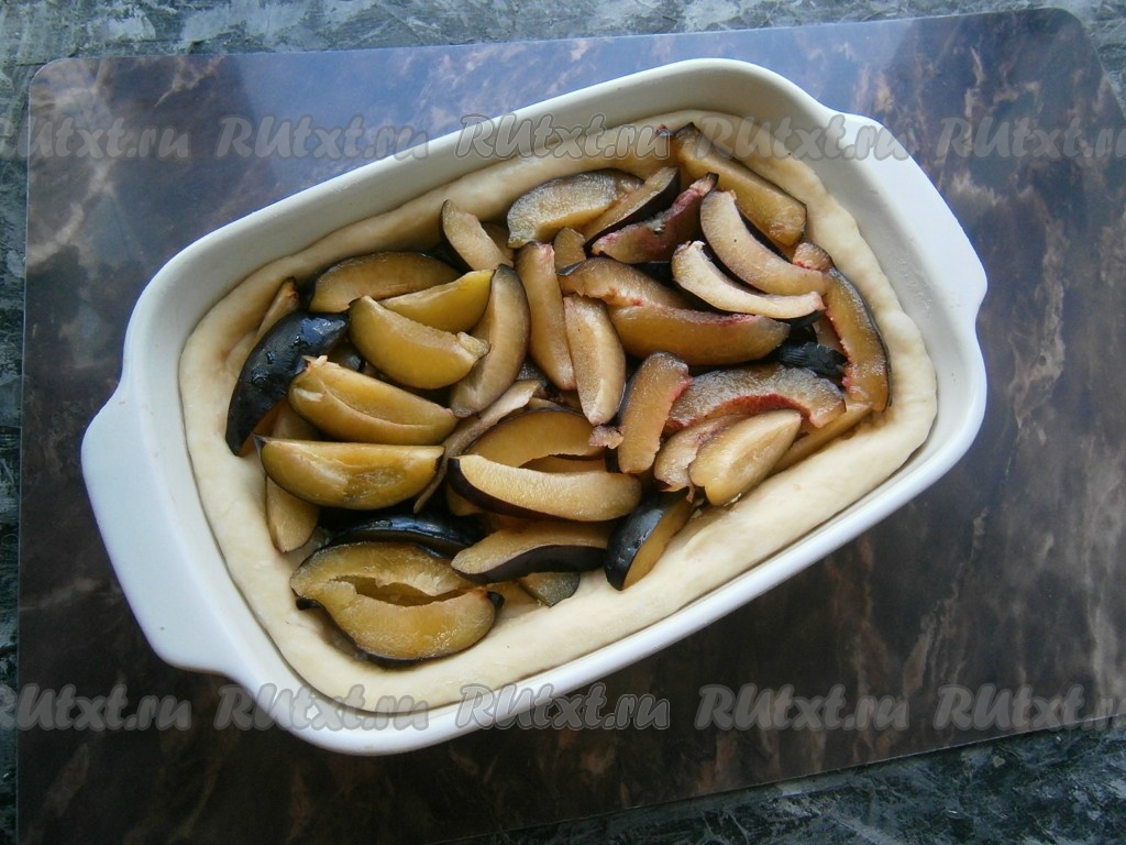 Сливы освободить от косточек, нарезать их дольками. Выложить нарезанные сливы на тесто, разровнять.