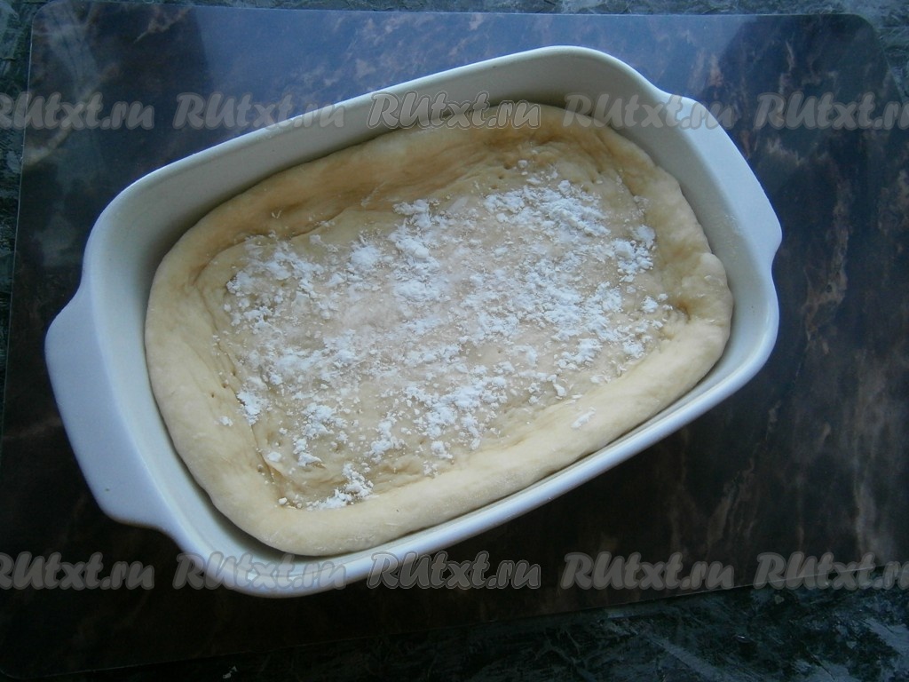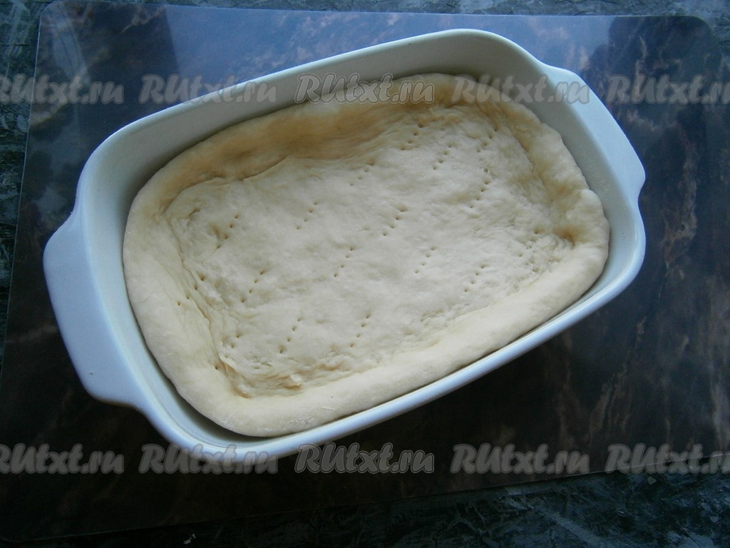 Тесто обмять, раскатать в лепёшку толщиной около 0,5-1 см. Выложить в форму, чуть смазанную растительным маслом, формируя бортики. Наколоть тесто на дне формы вилкой. У меня форма прямоугольная размером 20х16 см.