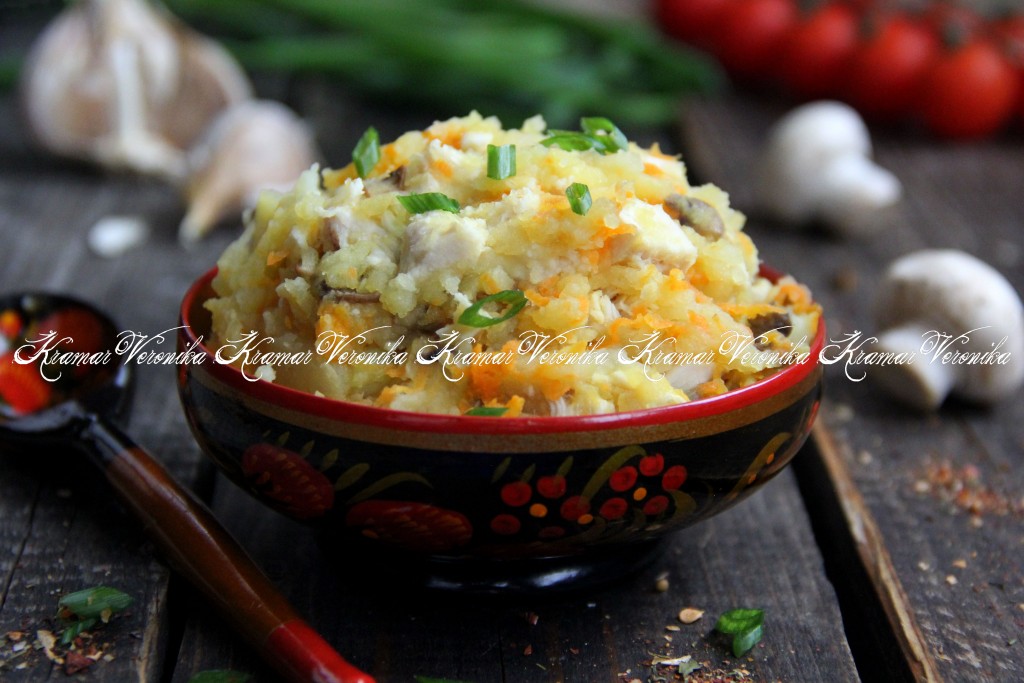 Хочу поделиться интересным и очень простым рецептом приготовления картофельного пюре с курицей и грибами. Блюдо получается очень вкусным, сытным и аппетитным. Такая картошка с курицей и шампиньонами станет полноценным обедом или ужином. Ведь в этом блюде удачно сочетаются и гарнир, и мясо, и овощи с грибами. Очень вкусно, попробуйте!