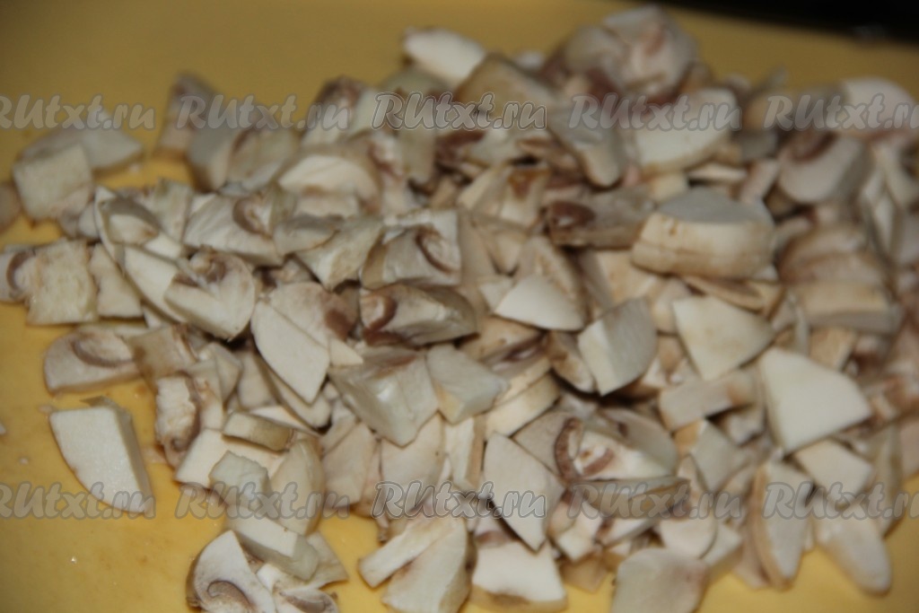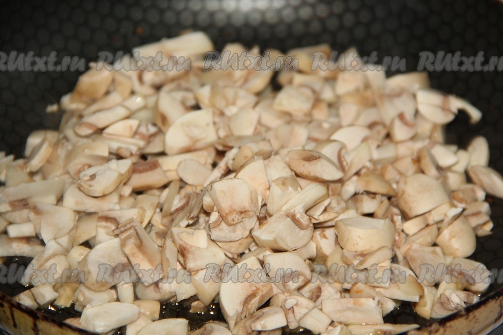 В сковороду влить растительное масло и выложить нарезанные шампиньоны.