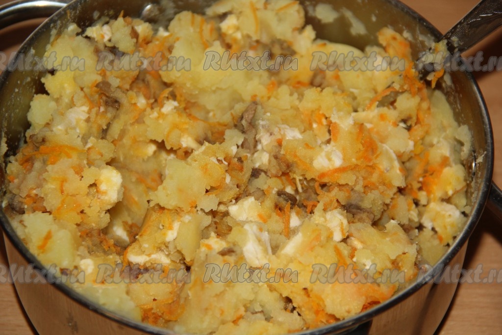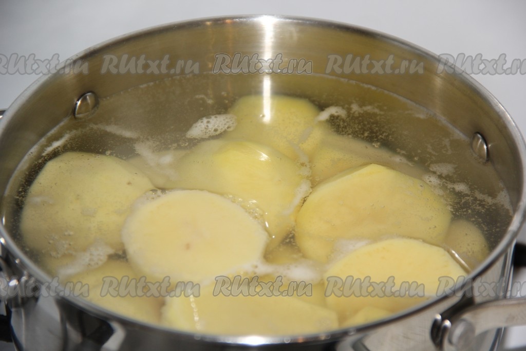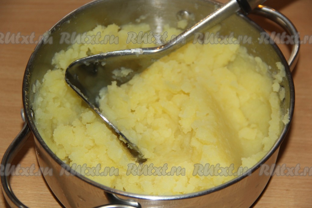 С готового отварного картофеля слить воду и растолочь в пюре.