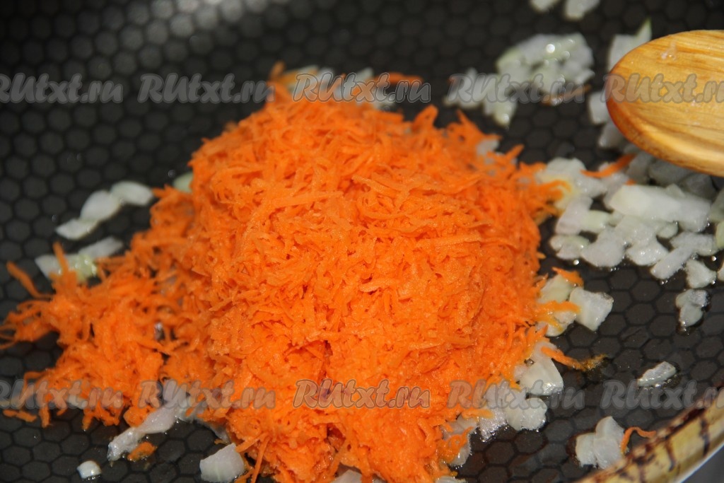 По истечении 3 минут к луку добавить морковь, натёртую на мелкой тёрке, обжаривать, иногда помешивая, в течение 7 минут на среднем огне. Затем переложить овощную зажарку со сковороды на тарелку.