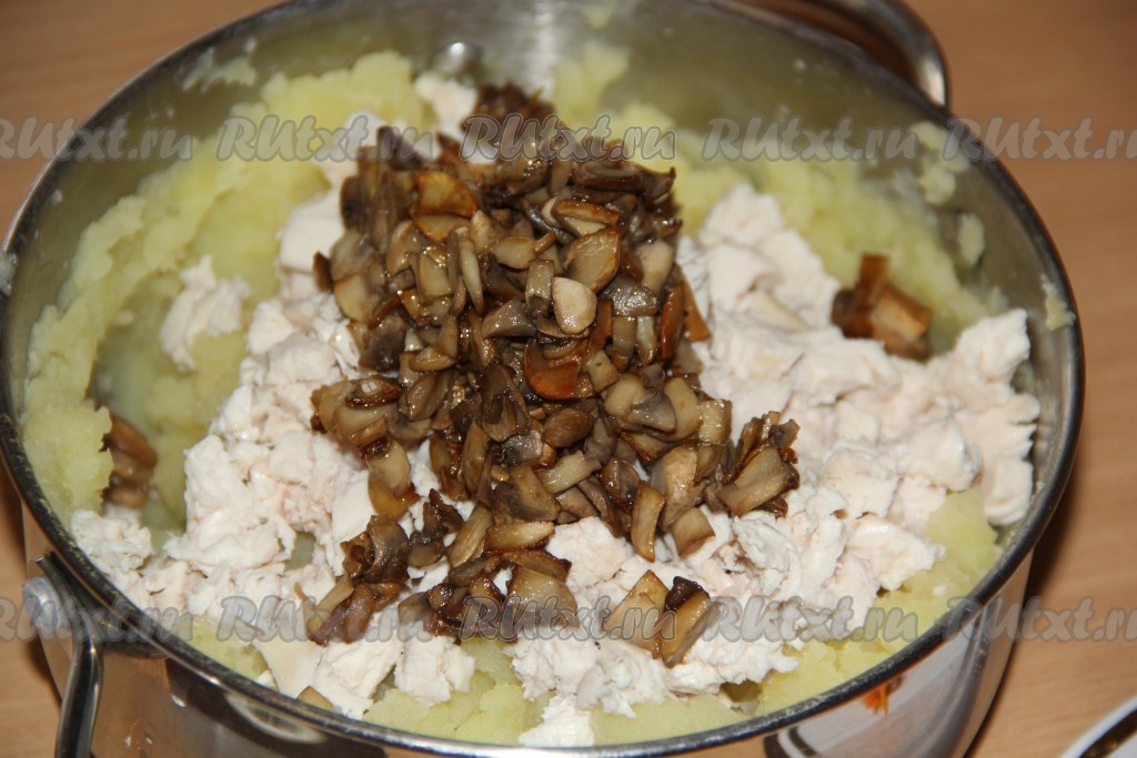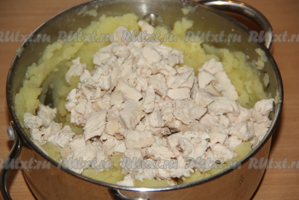Отваренное куриное мясо нарезать на кусочки и добавить в горячее картофельное пюре.
